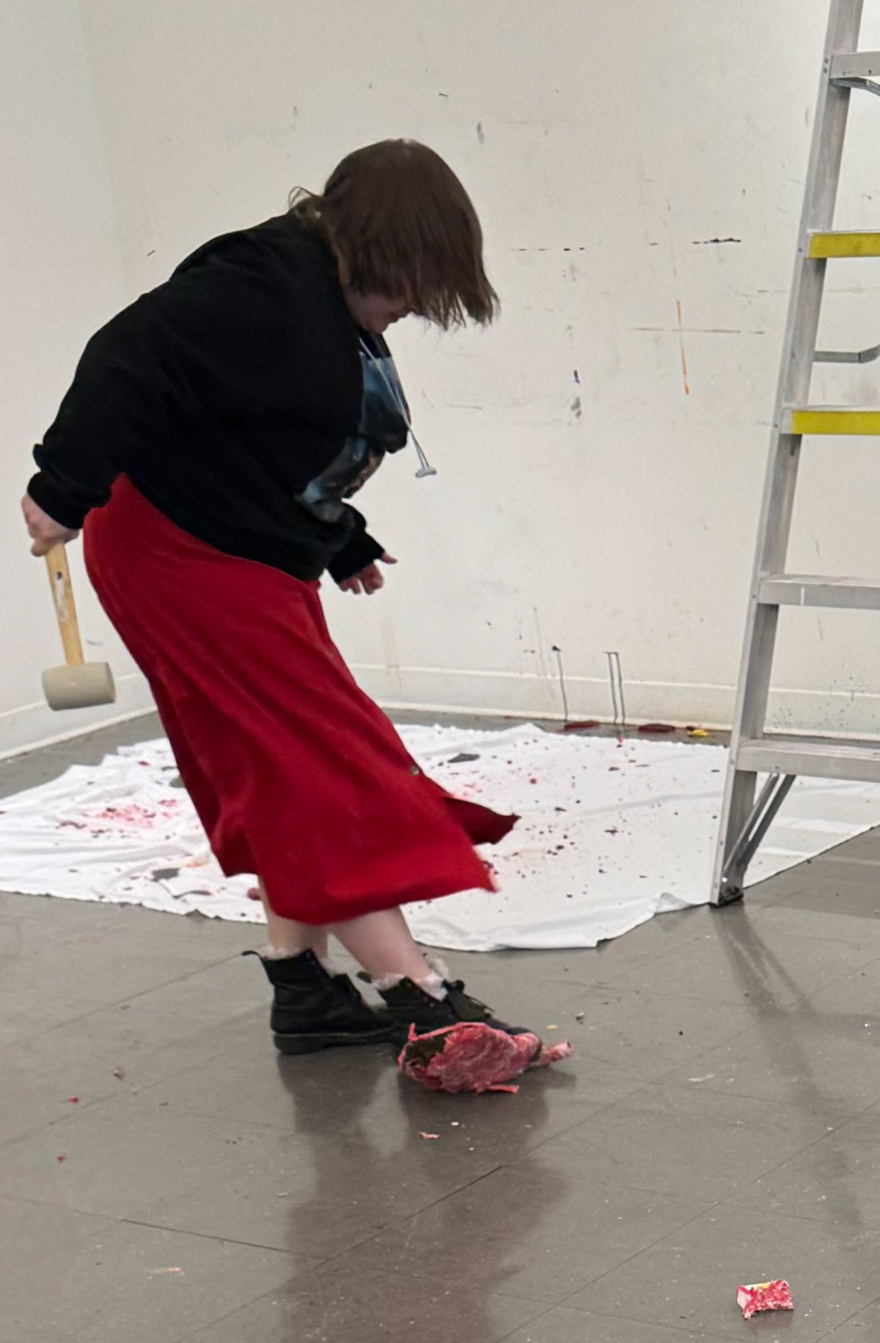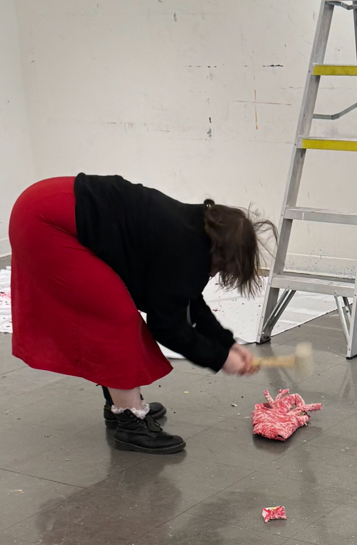 I'm always breaking my own heart (2025) paper-mâché, cardboard, masking tape, crepe paper, rubber mallet, anger & sadness